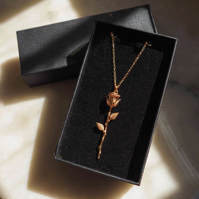I took my time with the paper, savoring the rustle, and when I lifted the lid, my breath caught. Inside was a delicate gold necklace, the pendant shaped like a single rose, its petals detailed so finely they almost seemed soft.