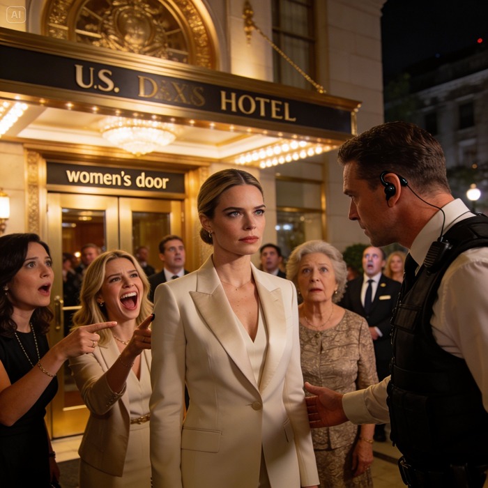 The doorman opened the door, polite smile ready—then his eyes flicked to something on an earpiece and his posture changed. He straightened, suddenly serious.