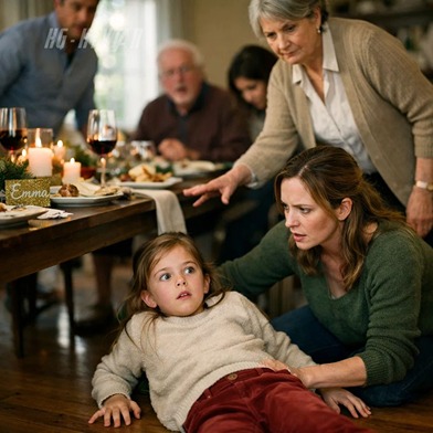 I saw the change instantly—the tightening in my mother’s face. “That won’t work,” she said coolly. “Ellie, darling, children sit at the kids’ table.” “We don’t have one,” Ellie replied. “I’m eight now.” “She’s staying,” I said gently. “We already talked about it.” I watched the decision settle across my mother’s face like a shadow. She stepped forward. Her fingers wrapped around the back of the chair. Her other hand pressed flat against Ellie’s shoulder. She pushed. Not violently, but with zero hesitation. Ellie’s foot caught on the rug and she fell, her palms striking the hardwood with a sharp sound. The room went silent. My mother looked down, not with regret, but with irritation. “This table is for family,” she said evenly. “Go sit somewhere else.” I crossed the room, helped my daughter up, and looked directly at my mother. “You just lost your family.” Five words. What my mother didn’t know was that I had already found the college acceptance letters she’d hidden in that storage unit years ago. The officers arrived at her door later that evening to deliver a formal warning for her behavior, but the real consequence was the document I was about to sign—the one that removed her from our lives and our estate entirely.