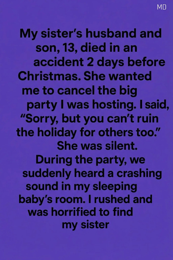 The night of the party arrived with forced cheer. Music filled the house, laughter echoed from room to room, and holiday candles burned brightly on every surface. Yet beneath the sparkle, I felt unsettled. I kept thinking about my sister sitting alone in her darkened home. I tried to push the thought aside, reminding myself that she had chosen not to come. Then, in the middle of a toast, we heard a sudden crashing sound from the hallway leading to my baby’s room. The music stopped. Conversations froze. My heart dropped as I rushed down the corridor.