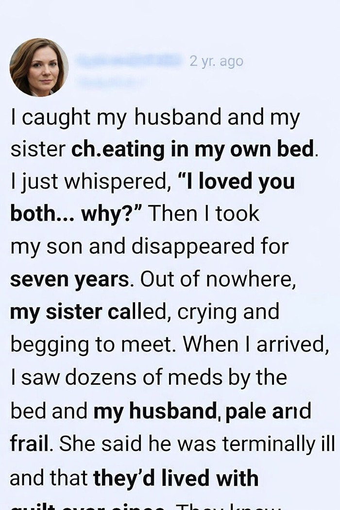 Seven years later, my phone rang. It was my sister, her voice trembling. Against instinct, I agreed to meet. Her apartment smelled sterile, and beside her stood my husband—thin, weak, and very ill. Regret filled the room. She spoke of guilt, silence, and the life they knew they had broken. Then she handed me a bank card—savings for my son’s future.