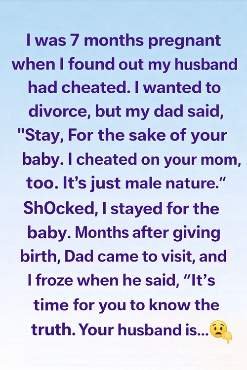 When I was seven months pregnant, my world cracked open. That was the day I found out my husband was having an affair. The pain felt physical — like the air had been ripped from my lungs. I remember sitting on the bed, phone in my hand, rereading messages I wished I had never seen while my baby kicked inside me. My first instinct was divorce. End it immediately. But when my dad came into the room and saw me falling apart, he surprised me. “You should stay,” he said quietly. “At least for now. For the baby.”