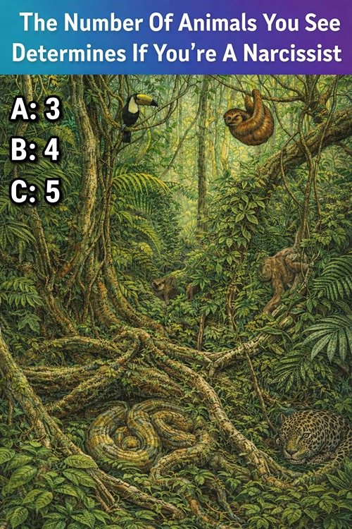 Some versions of this image make a bold claim: “The number of animals you see determines if you’re a narcissist.” Viewers are often asked how many animals they can find — three, four, or even five. With careful observation, you might notice a toucan on a branch, a sloth hanging from a limb, a snake near the forest floor, a monkey tucked into the greenery, or a large cat resting in the shadows. Some people see a few right away, while others take longer to uncover them all.