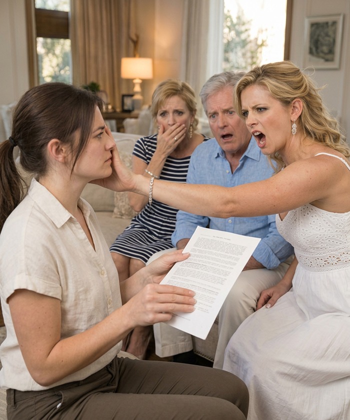 I looked at all three of them and felt something inside me turn cold. Then, slowly, I opened my handbag and pulled out a sealed envelope I had brought just in case. I placed one document on the coffee table between us.