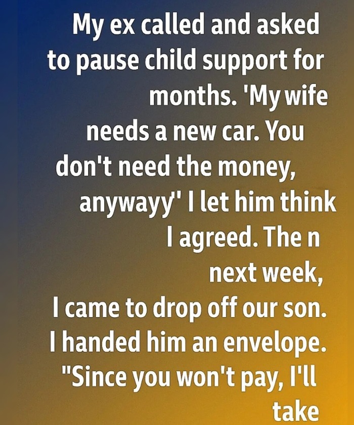 My ex called and asked to pause child support for months. “My wife needs a new car. You don’t need the money, anyway,” he said. I let him think I agreed. The next week, when I came to drop off our son, I handed him an envelope. “Since you won’t pay, I’ll take responsibility in a different way,” I said calmly. Inside wasn’t a bill or a demand—just a neatly typed letter outlining the updated parenting schedule I intended to file with the court. It proposed reducing his visitation until he could consistently support our son’s needs.