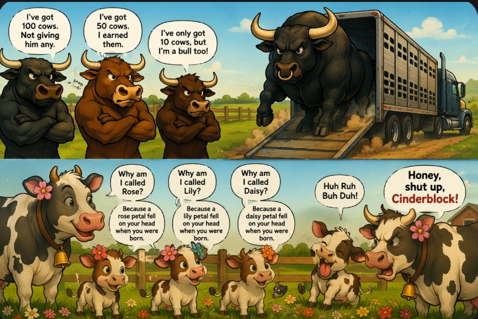 The third bull said, “I’ve only been here one year, and you’ve only given me 10 cows. I may be smaller, but I’m keeping all of mine.”