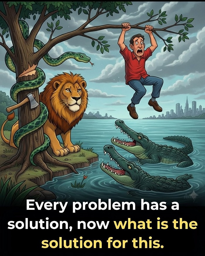 In this scenario, a man stands surrounded by deadly threats on every side. To his right, a snake waits to strike. On his left is a tree that would topple into a lake full of crocodiles. Close by, a lion prowls the area. At first, there’s no path to safety and no clear way out. But the solution lies in waiting. If the man is patient, the lion will eventually go to the lake to drink, distracting the crocodiles. During this moment of confusion, the man can quietly slip away, unnoticed. This riddle proves that sometimes, survival depends more on timing and calm than brute force or speed.