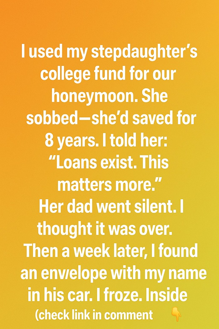 Everything seemed perfect after our honeymoon—until reality hit harder than I expected. I had made a decision I thought was practical at the time: using my stepdaughter’s college fund to help pay for our trip. She had saved for eight years, and when she cried, I dismissed it with, “There are always student loans.” Her father went silent. I assumed the tension would fade… until days later, I found an envelope with my name on it tucked in his car. Inside was a handwritten letter that would change everything. Instead of anger, it held quiet honesty, explaining how deeply that fund symbolized trust, effort, and a future he had promised his daughter. Only then did I realize the true weight of my actions.