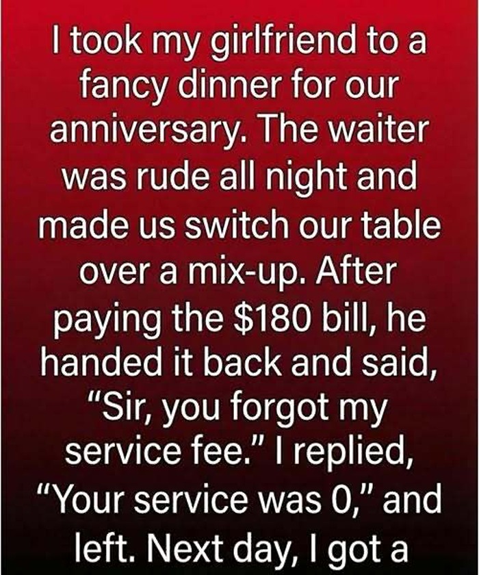 When the bill arrived, I paid without hesitation. The amount didn’t trouble me, but when the waiter returned and accused me of forgetting the service fee, something deeper surfaced. I calmly said the service hadn’t earned one and walked away. Later, on the drive home, we talked about respect and boundaries, agreeing that how we respond in small moments reveals who we are. The next day, the manager called to apologize sincerely, and the evening finally found its closure. What stayed with me wasn’t disappointment, but the lesson that dignity, honesty, and self-respect matter more than any perfect plan.