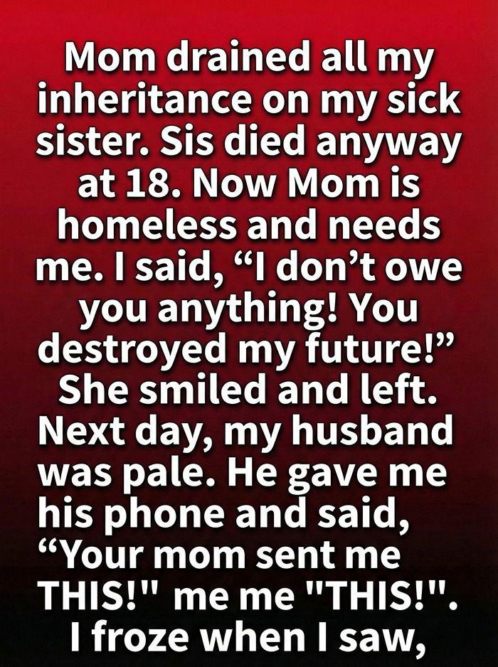 The next morning, everything changed. Mara walked into the kitchen and saw her husband standing completely still, his face drained of color as he held out his phone without a word. A message had come in late at night from an unknown number—and it was from her mother. Attached was a photo of a folded document beside a small silver locket Mara recognized instantly: her sister’s favorite, the one she used to wear like it was a piece of comfort. Under the photo were words that made Mara’s stomach drop: “I never touched your inheritance. I spent my own savings. The account is still only in your name. I kept her locket safe… for when you were ready.” Beneath that was an address scribbled like a final chance. Mara read it again and again, her anger suddenly collapsing into shock.