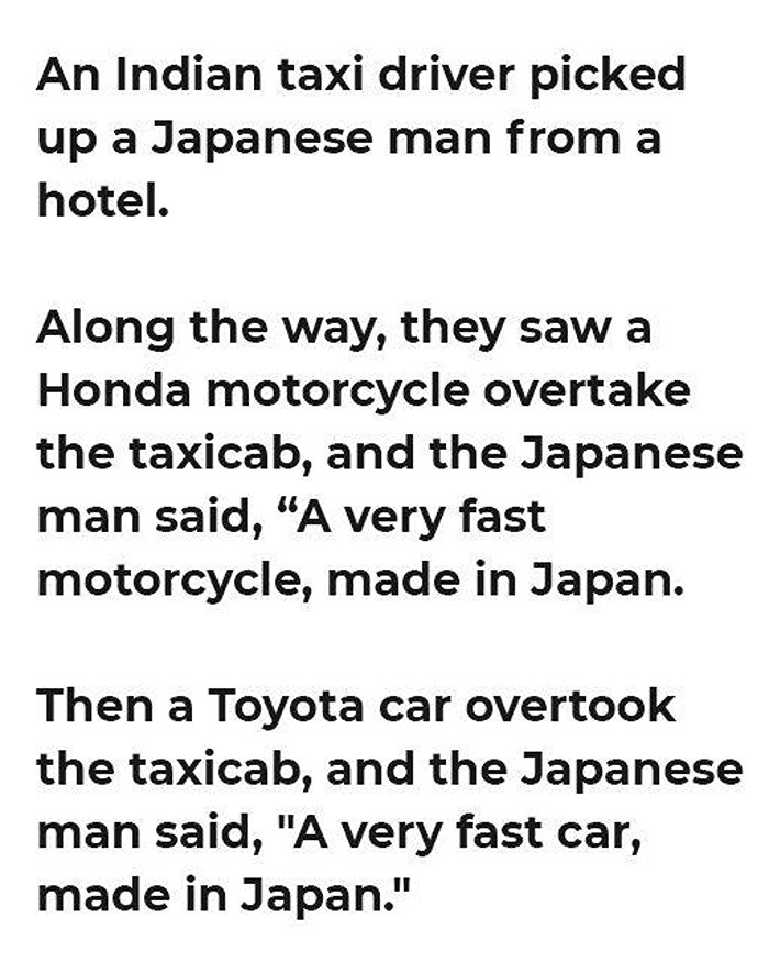 Then a Toyota car overtook the taxicab, and the Japanese man said, “A very fast car, made in Japan.”