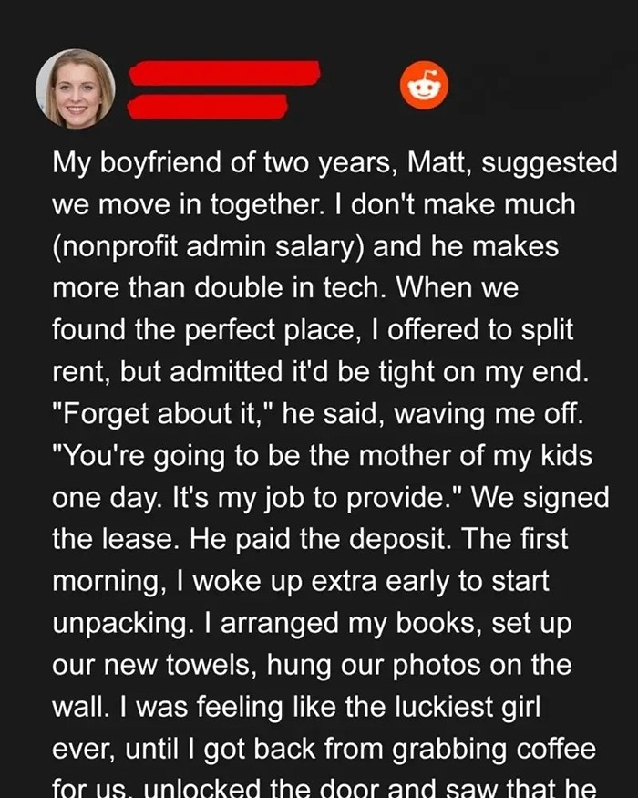 My boyfriend of two years, Matt, suggested we move in together. I don’t make much (nonprofit admin salary) and he makes more than double in tech. When we found the perfect place, I offered to split rent, but admitted it’d be tight on my end.