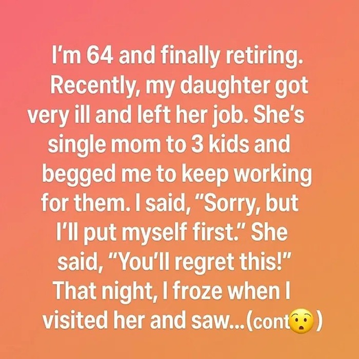 My daughter, a single mother of three, became very ill and had to leave her job. With tears in her eyes, she asked me to keep working a little longer to help her family. My heart ached, but I said, “I’m sorry, but this time I must put myself first.” Her reply cut deep: “You’ll regret this.”