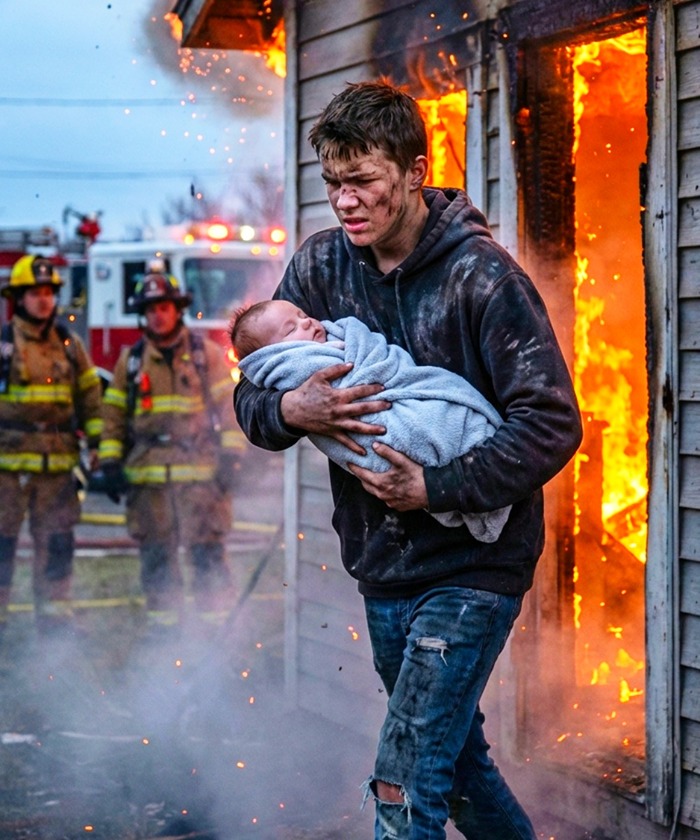 The boy stumbled out, coughing violently, clutching a tiny bundle to his chest. The baby was crying — loud, alive, furious at the world. Her small face streaked with soot but unharmed.