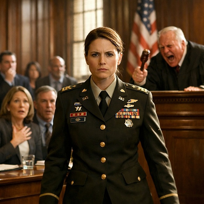 The polished floor carried the echo of my steps forward—measured, even, deliberate. My service dress uniform fit like it had been tailored to my bones. Every ribbon was aligned. Every medal fixed in place. Years of discipline translated into neat geometry across my chest. The overhead lights caught on the metal and sent thin glints across the courtroom walls.