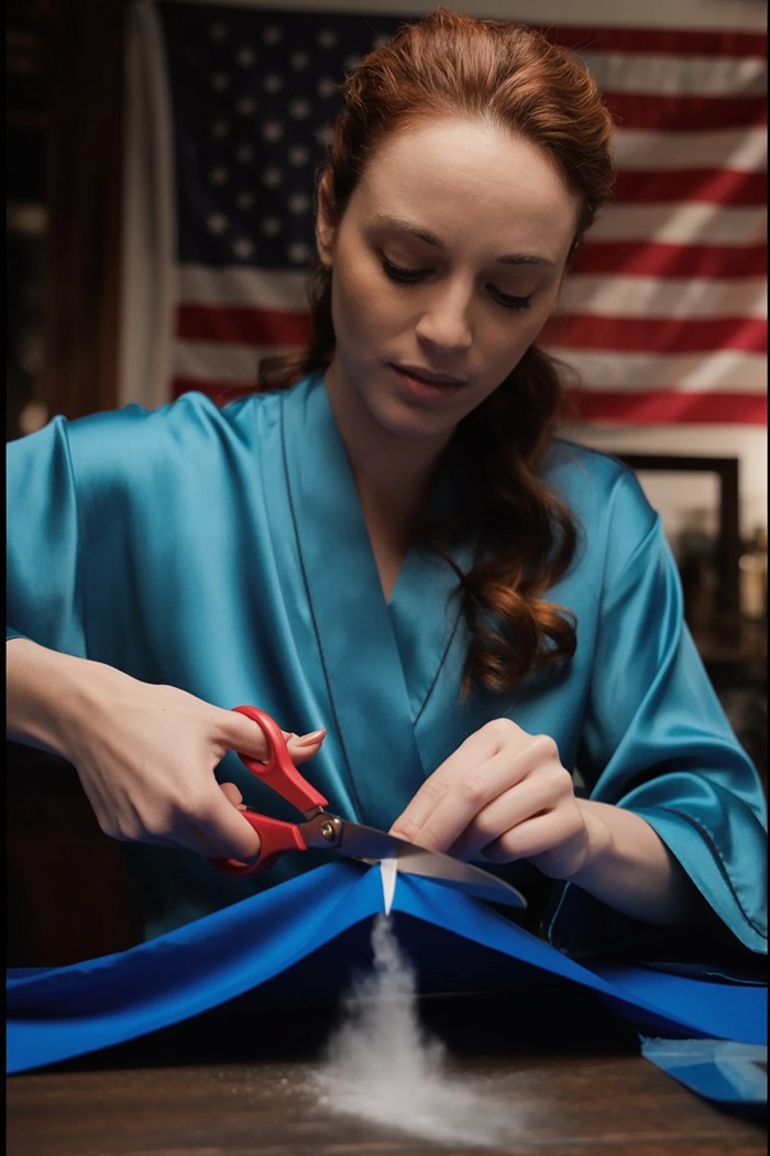 I went to the dresser. I found the small sewing scissors in the top drawer. I brought them back to the bed and laid the dress out flat, inside out, switched on the bright lamp, and located the spot near the waist seam.