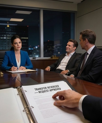 Because tucked behind the “Legal” tab was a printed notice he had never seen before: TRANSFER REVERSED — REQUEST APPROVED.