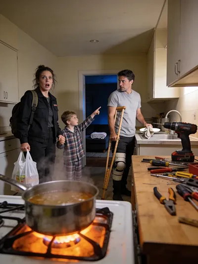A tall man turned slowly beside the stove, balancing carefully with a medical brace strapped firmly around his knee, and for one breathless instant my mind refused to reconcile the stranger’s presence with the quiet domestic normalcy unfolding before me.